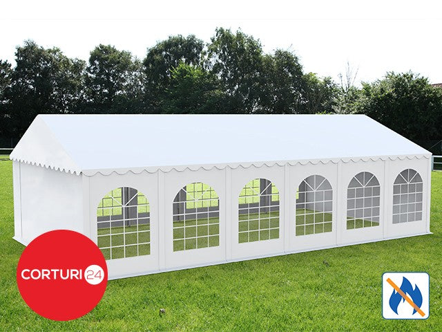 Acest cort este perfect pentru evenimente profi: un cort înalt, spațios datorită înălțimii laterale de 2.6 m. Cortul are țevi extrem de rezistente din oțel zincat, cadru de rigidizare la bază, sistem de contravântuire la acoperiș. Prelatele robuste sunt din PVC ignifug de 550g/m², material 100% impermeabil, cu protecție solară de 80+. Mai multe variante de configurare sunt posibile: pereții laterali pot fi montați individual la o distanță de 2m.